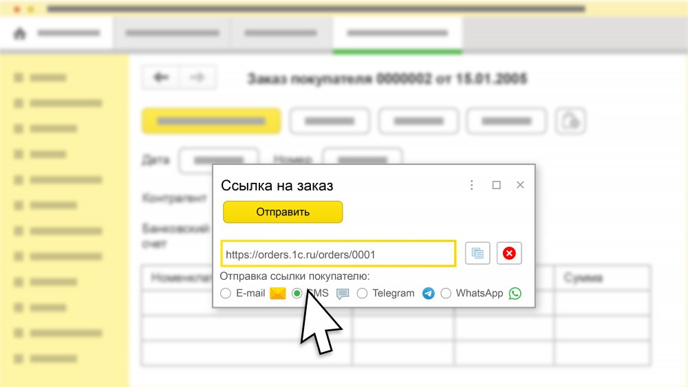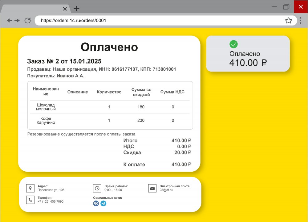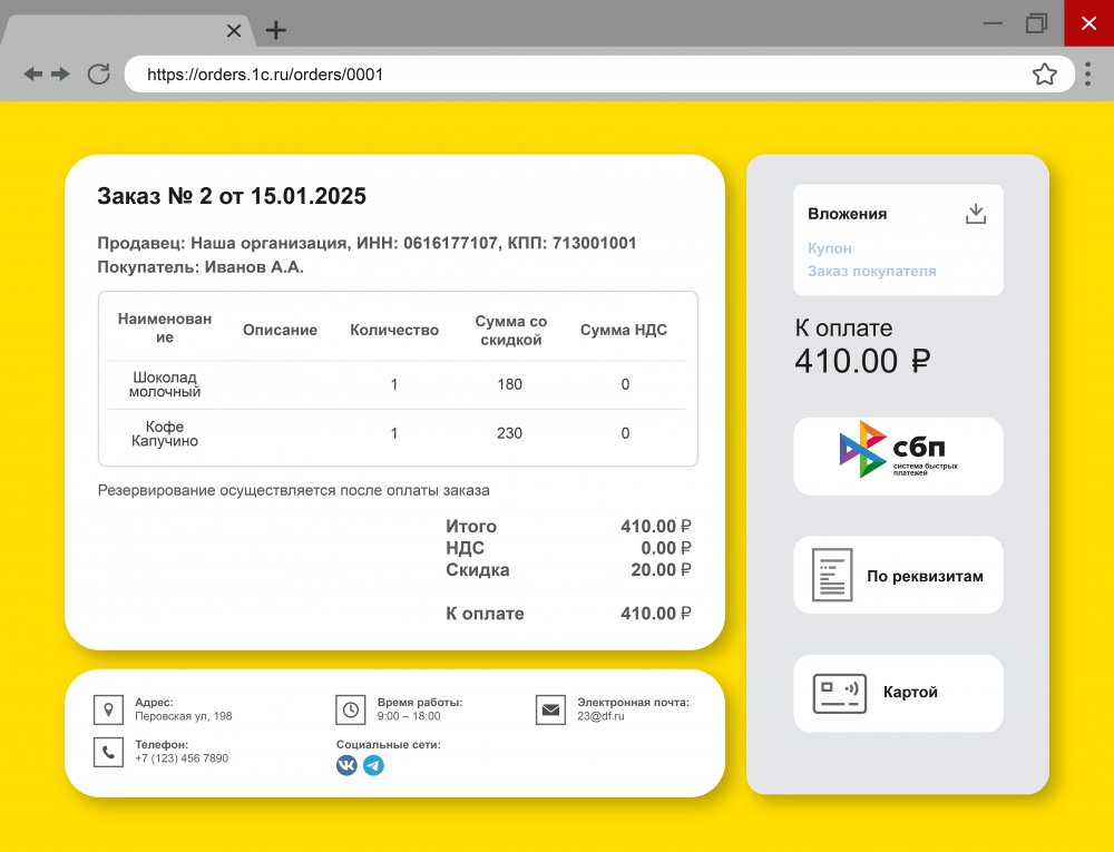 «1С:Онлайн-заказы» на основе документа в программе 1С формирует страницу с заказом клиента, которая доступна по специальной ссылке через любой браузер. Эту ссылку можно моментально передать клиенту для ознакомления и оплаты.