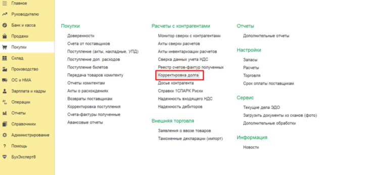 Документ находится во вкладках Продажи/Покупки – Расчеты с контрагентами – Корректировка долга.