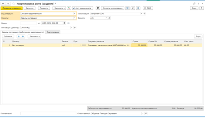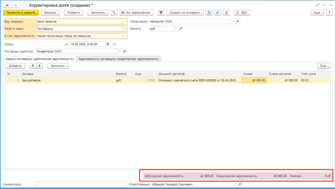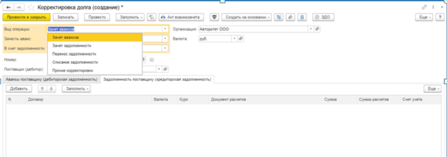 В документе Корректировка долга выбрать операцию Зачет авансов – Зачесть аванс поставщику в счет задолженности Нашей организации перед поставщиком – кнопка Заполнить в верхней панели документа. После автоматического заполнения проверить сумму, скорректировать.