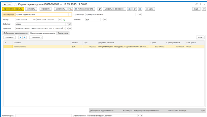 И последний вид корректировки – Прочие корректировки – используется, когда не подошли предыдущие варианты. Она позволяет указать разные виды договоров и сделать корректировки на разных счетах учета. Например, используется при реализации одному контрагенту, а оплата от другого.