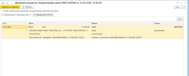 После проведения документа проверить суммы и счета учета, при необходимости можно откорректировать суммы.