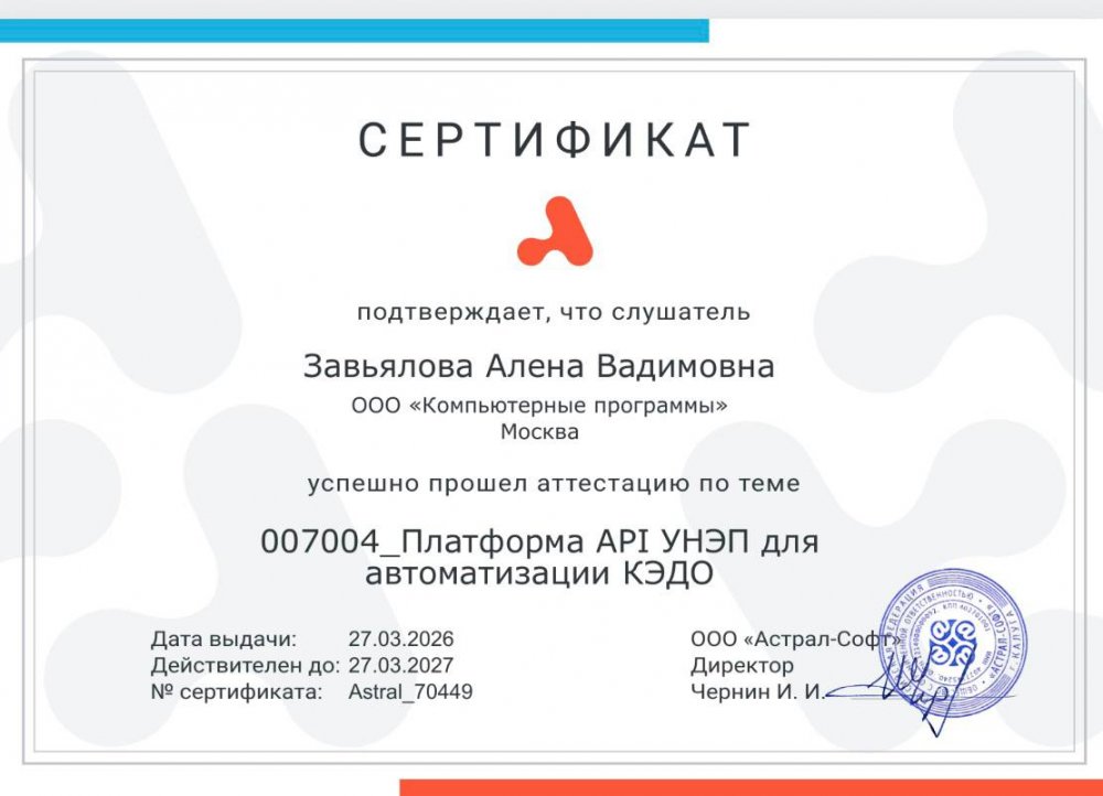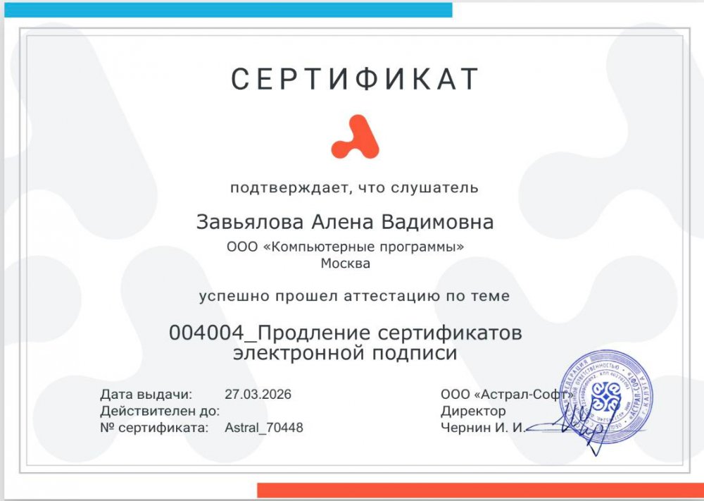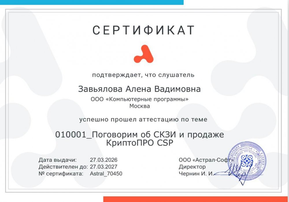 Алена Завьялова получила 4 сертификата, которые подтверждают компетенции в работе с электронной подписью, продлением сертификатов, API УНЭП для КЭДО и СКЗИ КриптоПРО CSP.