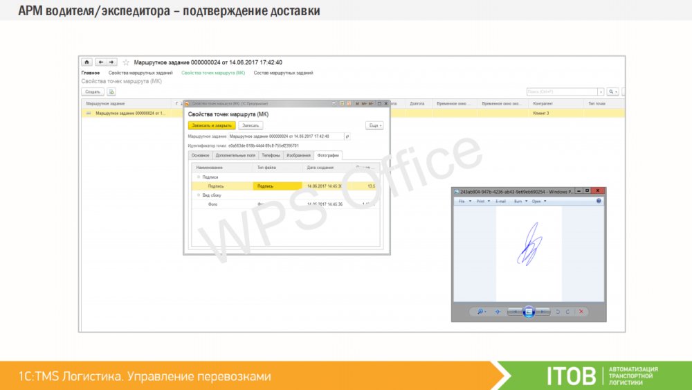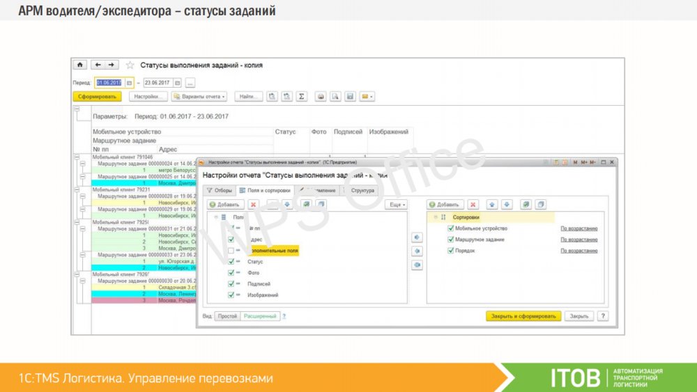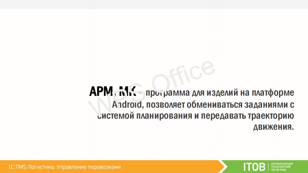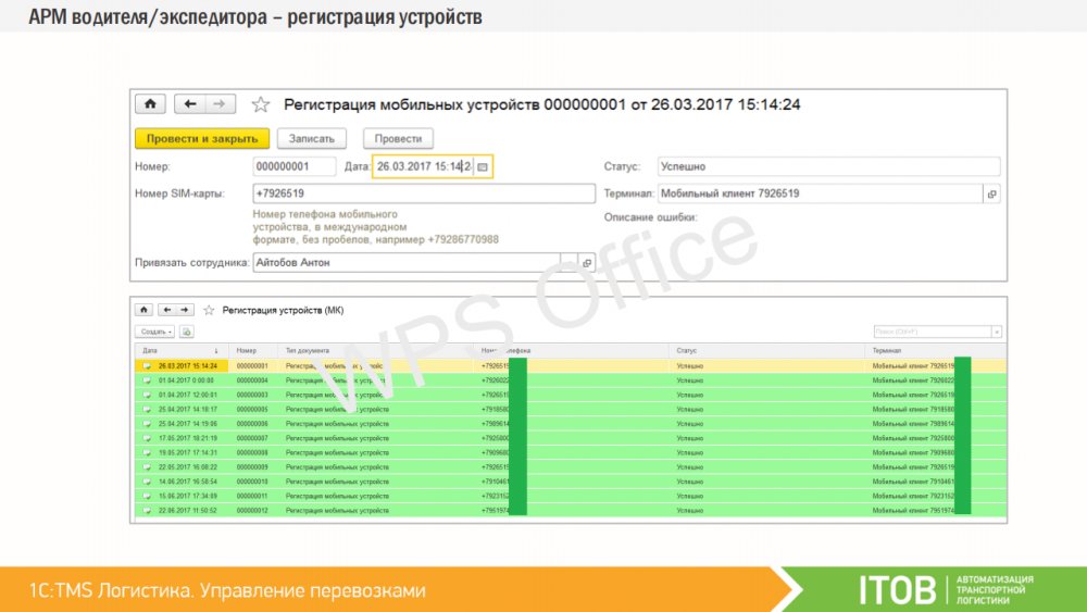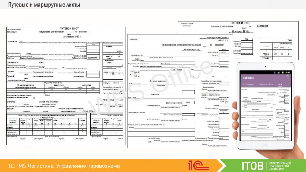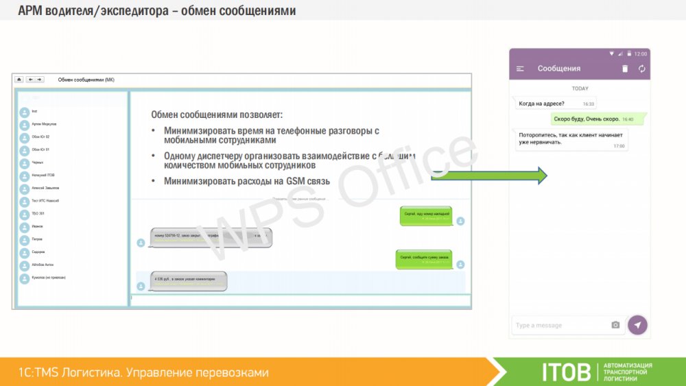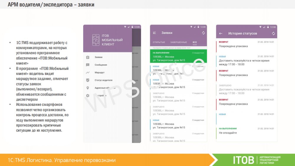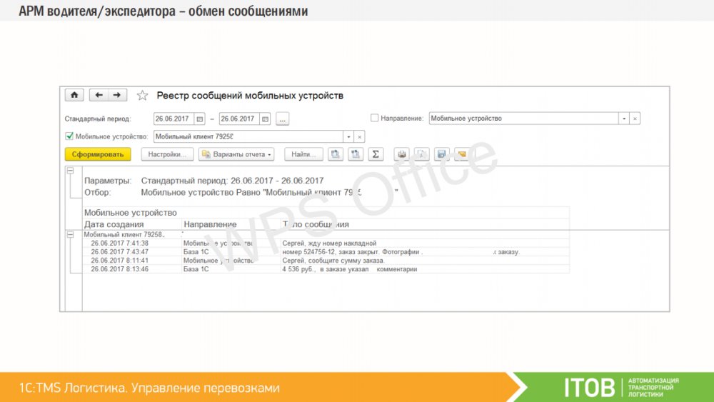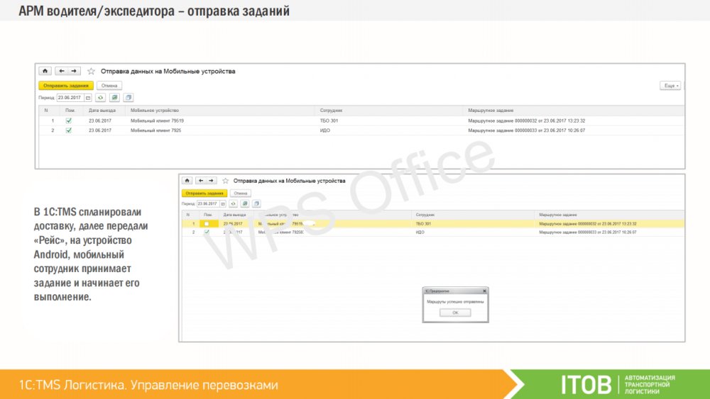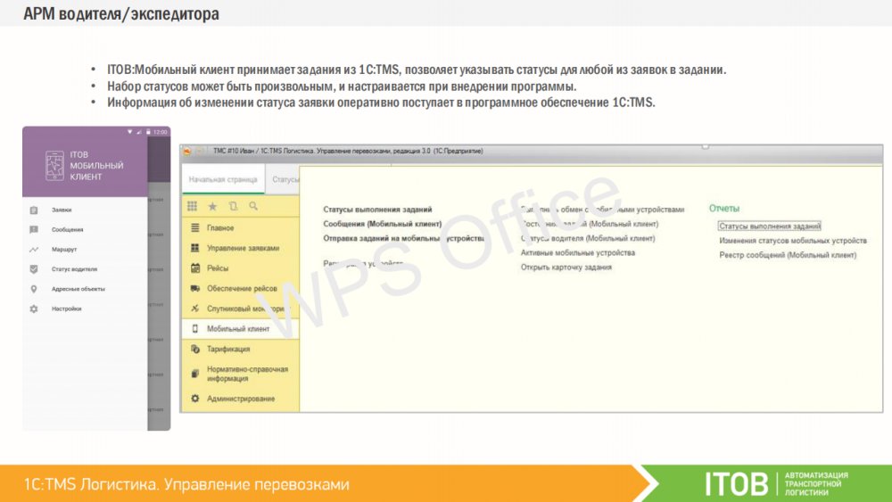 Водителей или курьеров можно оснастить мобильными устройствами, работающими под управлением операционной системы Android. Спланированные доставки из «1C:TMS» могут быть переданы на мобильные устройства сотрудникам, которые принимают задание и отражают статус о ходе его выполнения на каждом этапе. Таким образом, диспетчер и логист в реальном времени могут контролировать факт выполнения заданий, обмениваться текстовыми сообщениями, получать фото-отчёты и контролировать траекторию движения объекта. К «1С:TMS» могут быть подключены различные мобильные приложения. Первым таким работающим приложением является «ITOB:Мобильный клиент» – бесплатное приложение производства компании «ITOB».