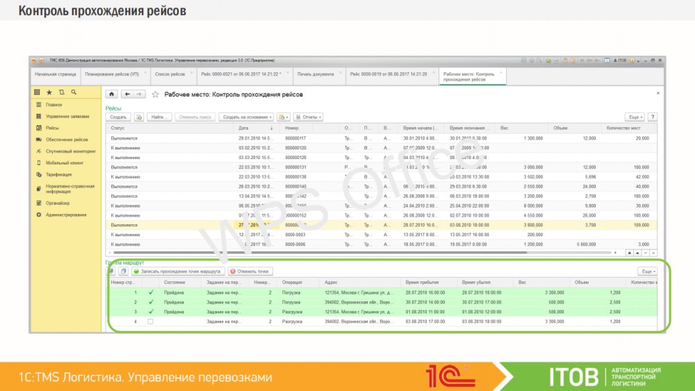 Подсистема позволяет фиксировать факт прохождения точек маршрута и осуществлять общий контроль за процессом выполнения Рейсов.