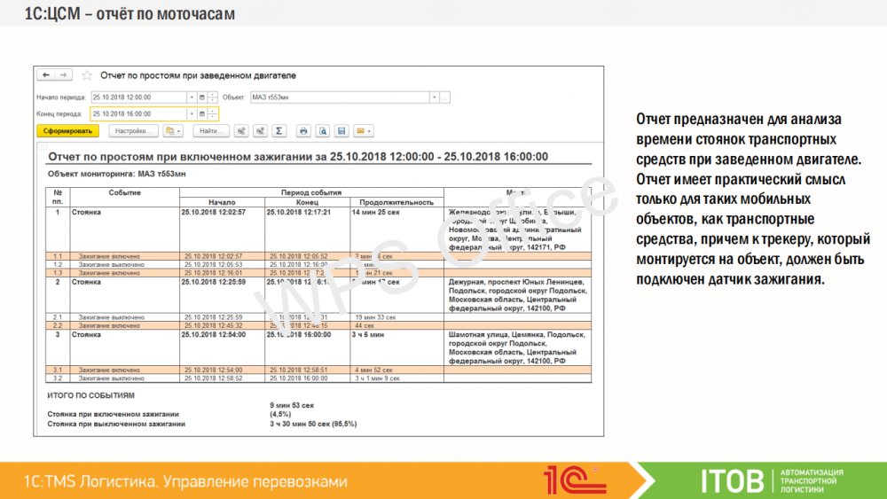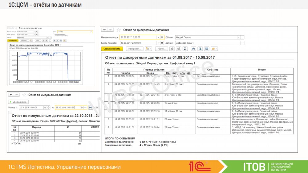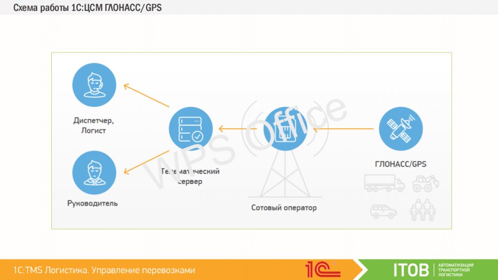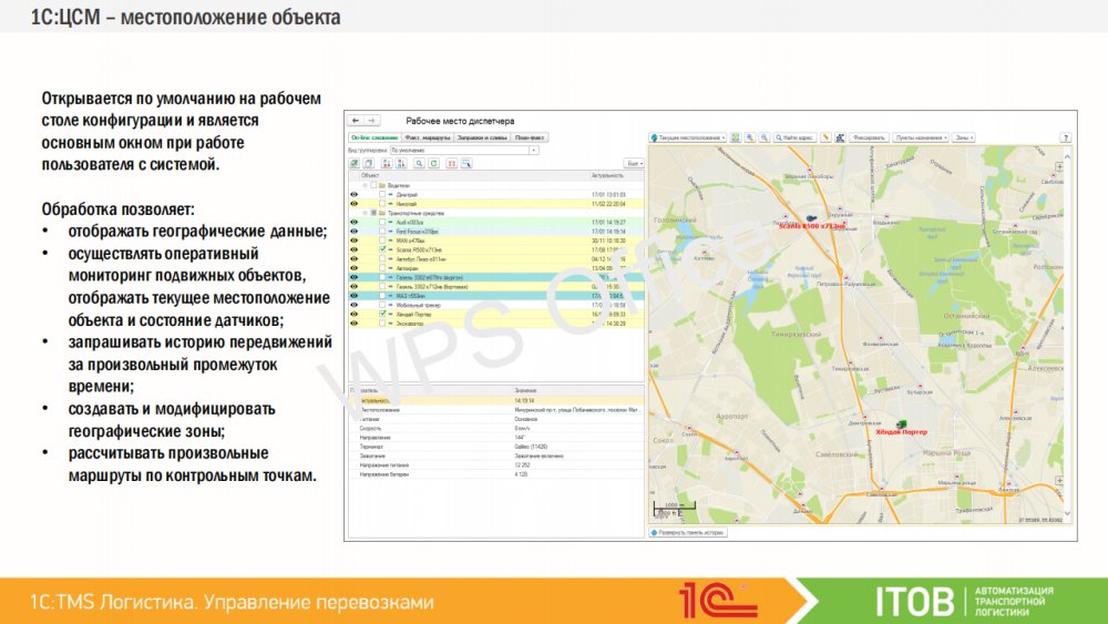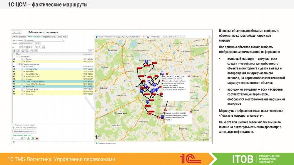 Совместное использование «1С TMS Логистика Управление перевозками» с «1С:Центр спутникового мониторинга ГЛОНАСС/GPS» расширит функциональные возможности системы и позволит дополнительно в режиме реального времени осуществлять мониторинг и контроль подвижных объектов, транспорта или персонала: