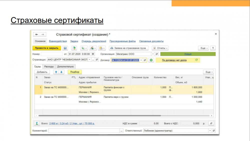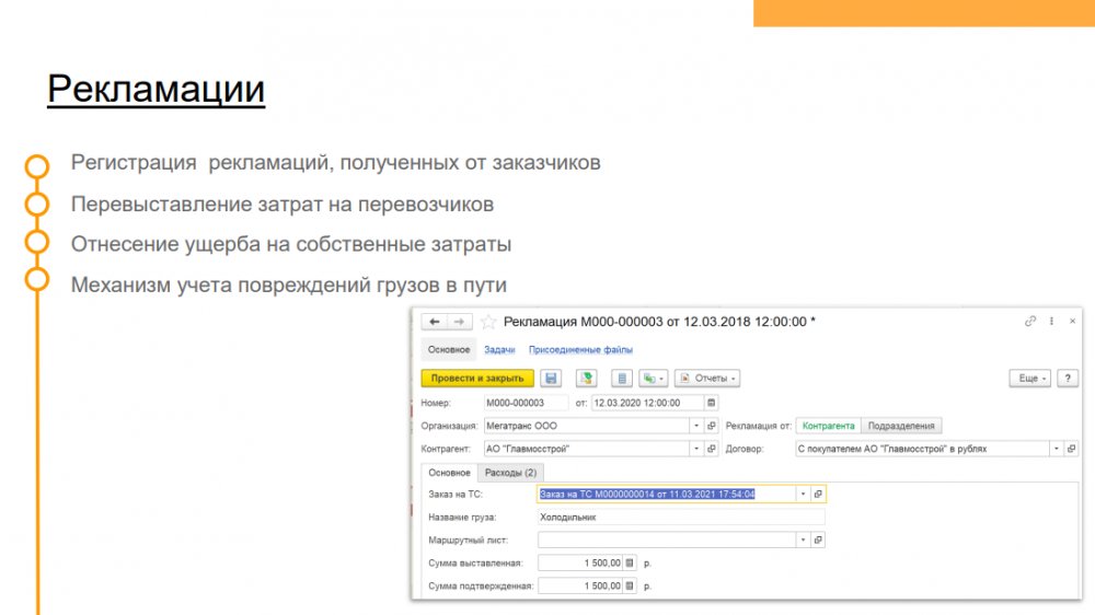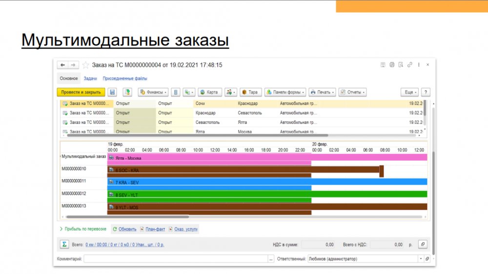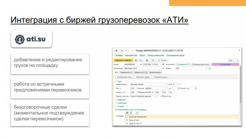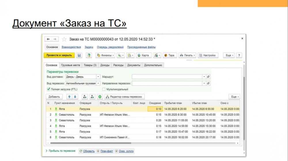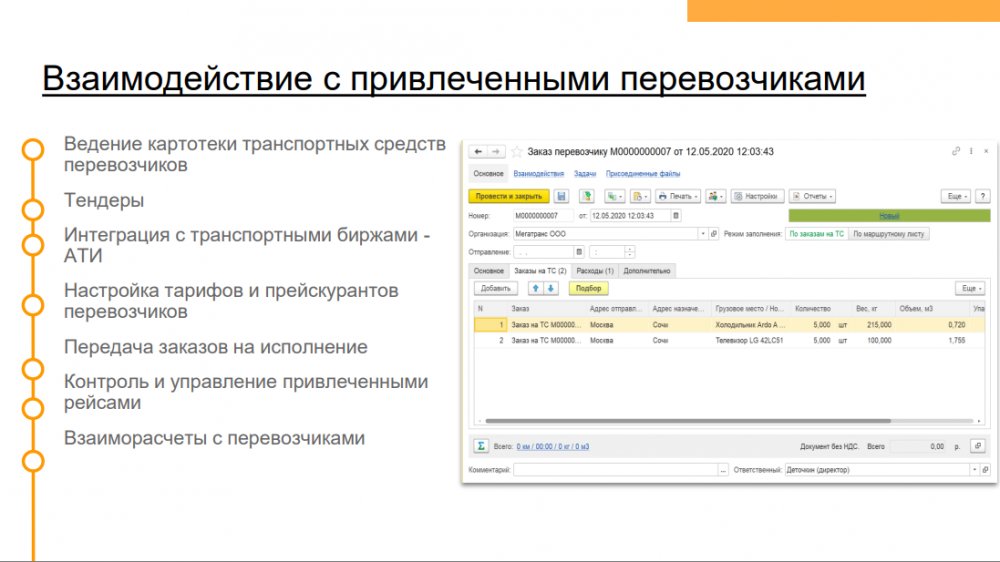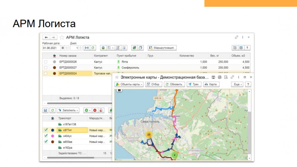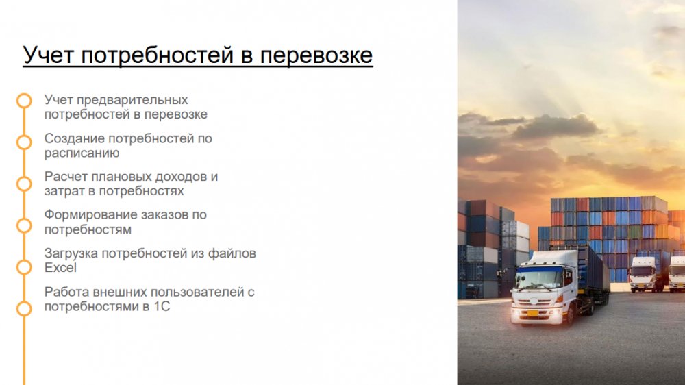 Продукт «1С Транспортная логистика 300 рабочих мест» – отраслевое решение, предназначенное для управления транспортными перевозками и экспедиторскими услугами. Функционал конфигурации позволяет осуществлять управление заказами на перевозки как собственным, так и привлеченным транспортом, учитывать мультимодальные перевозки, управлять собственным автопарком.