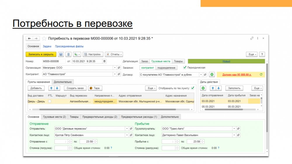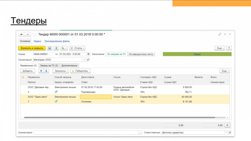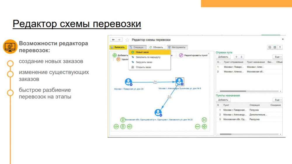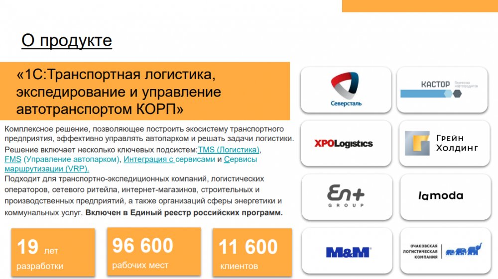 Продукт «1С:Предприятие 8. Транспортная логистика, экспедирование и управление автотранспортом КОРП» включает в себя: