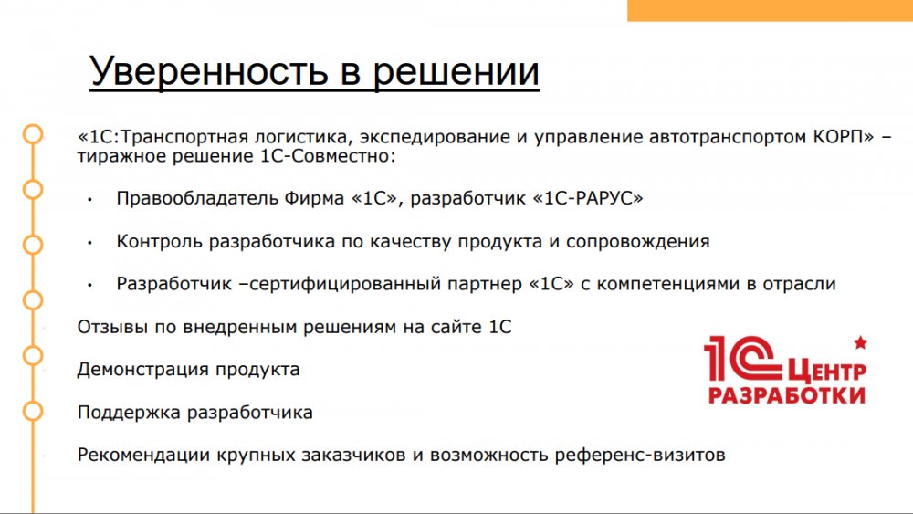 Сервисное обслуживание программных продуктов, содержащих конфигурацию «Транспортная логистика, экспедирование и управление автотранспортом КОРП» и поддержка пользователей в части работы с платформой «1С:Предприятие» осуществляется по договору Информационно-технологического сопровождения «1С:Предприятие» (1С:ИТС) с активным сервисом 1С:ИТС Отраслевой 1-й Категории.