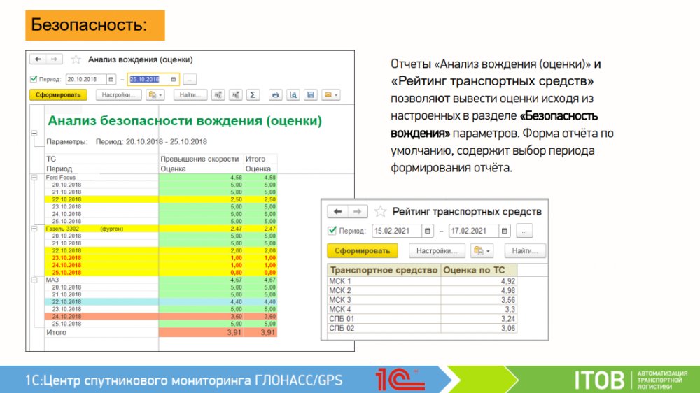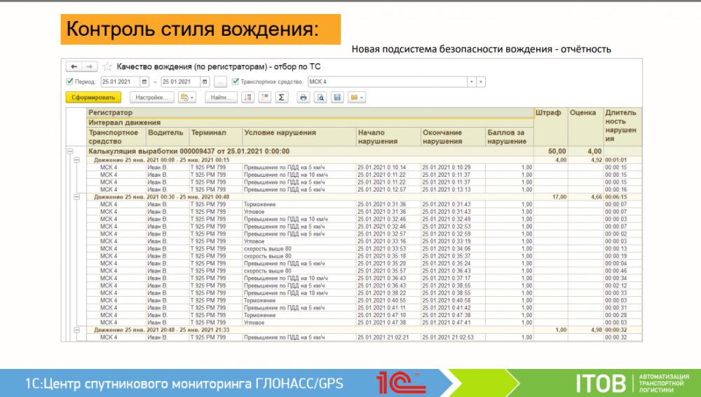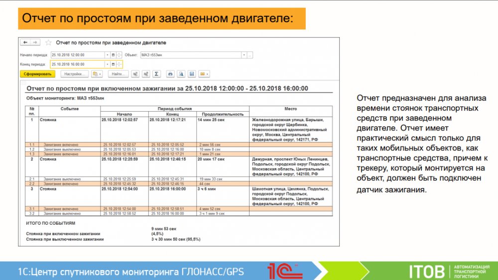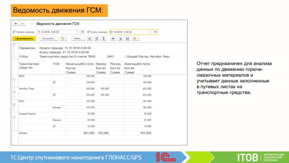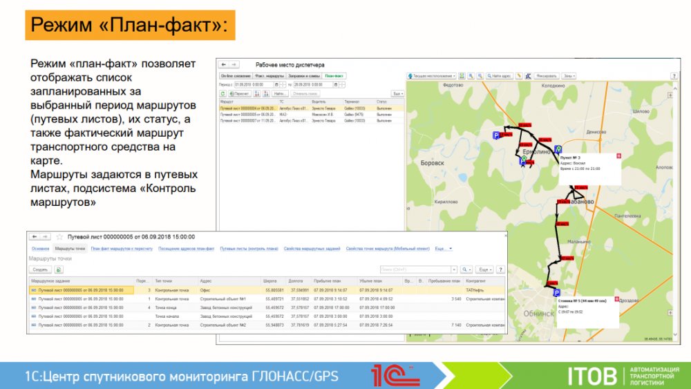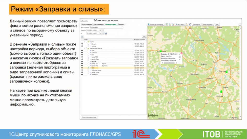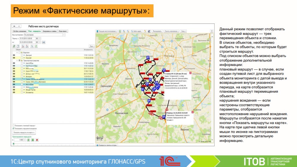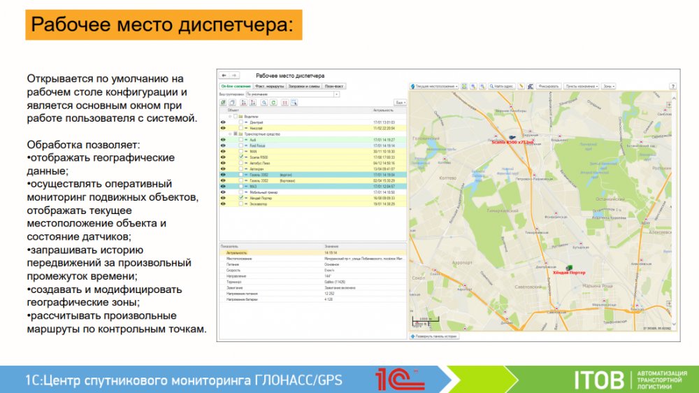 Программный продукт «1С:Предприятие 8. Центр спутникового мониторинга ГЛОНАСС/GPS» обеспечивает следующие возможности: