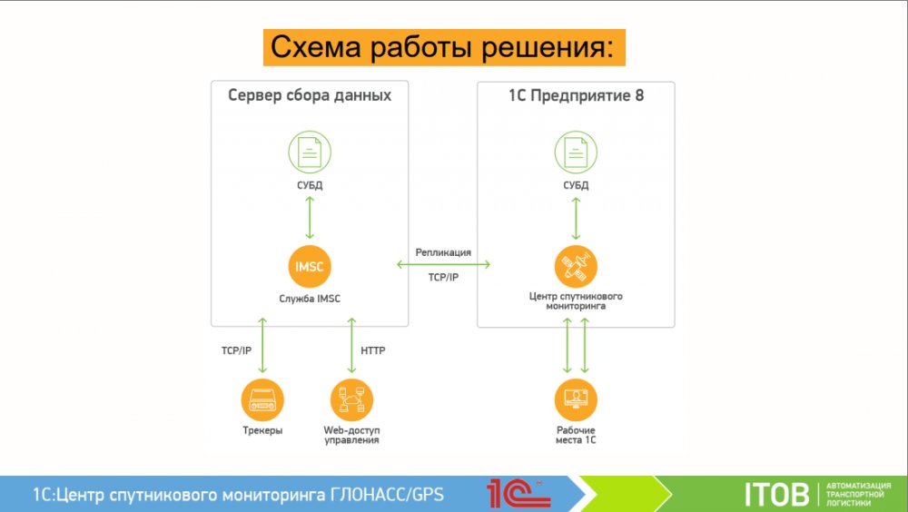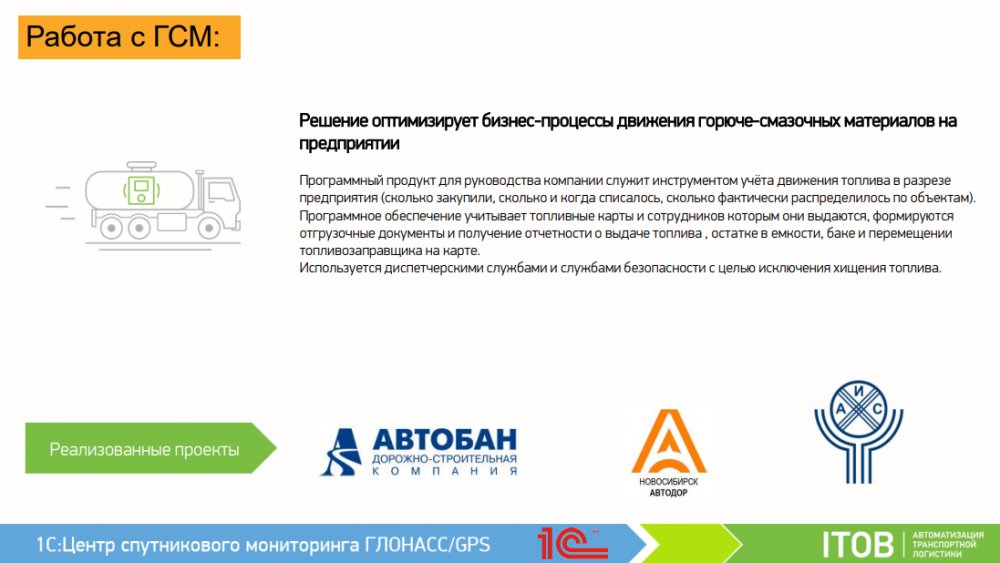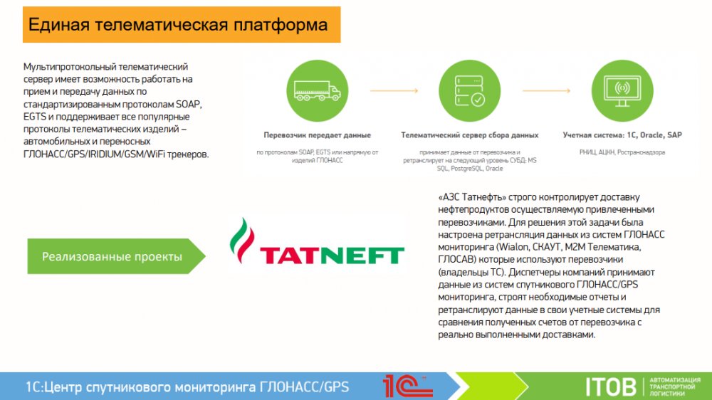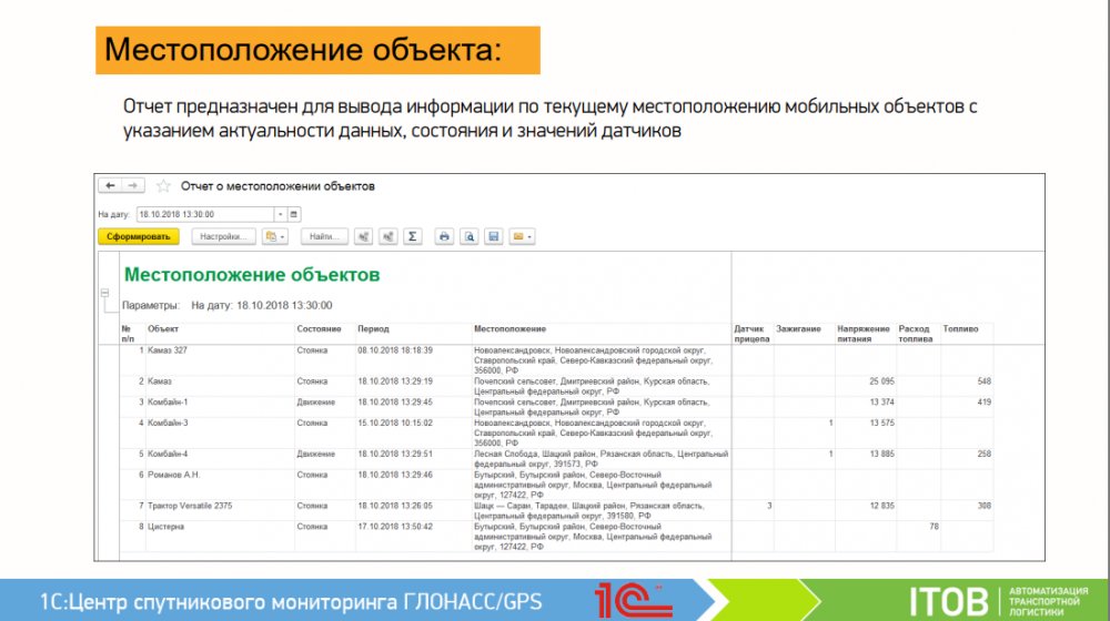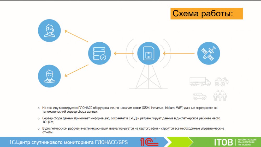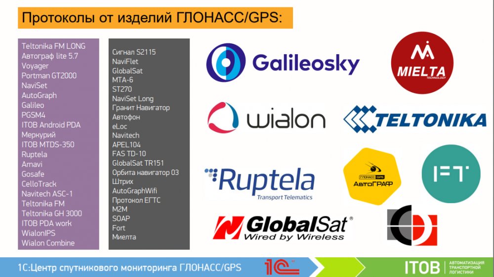 «1С:Предприятие 8. Центр спутникового мониторинга ГЛОНАСС/GPS» — новое специализированное решение на платформе «1С:Предприятие 8.2». Предназначенное для осуществления ГЛОНАСС/GPS мониторинга подвижных объектов, транспорта и персонала. Функциональные возможности решения позволяют получать в реальном времени информацию о перемещении объектов. На которых установлены автомобильные и персональные трекеры; GPS-навигаторы с модулем GSM, КПК и коммуникаторы на базе Windows Mobile 5.0 и выше. С GPS и GPRS модулями. Возможно получение информации с различных датчиков (температурный, датчик уровня топлива, тревожная кнопка SOS, CAN шина и др.).