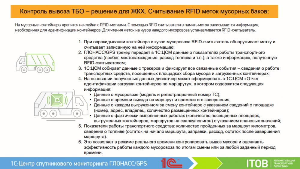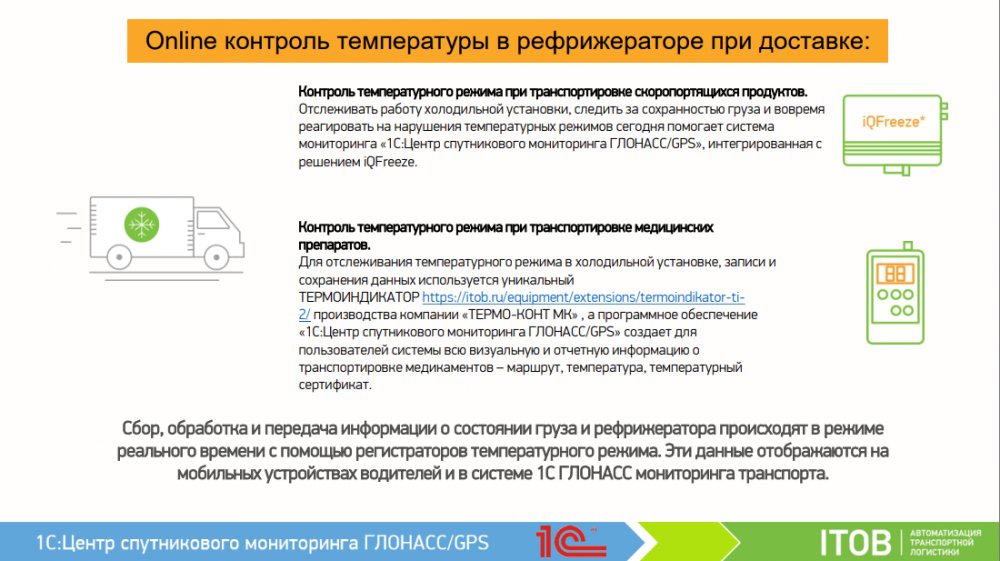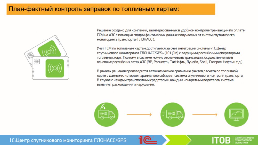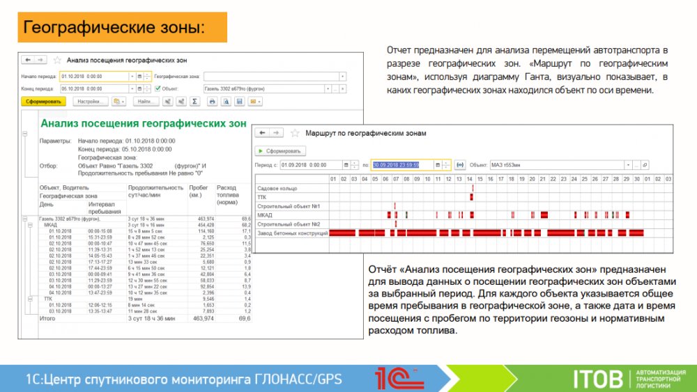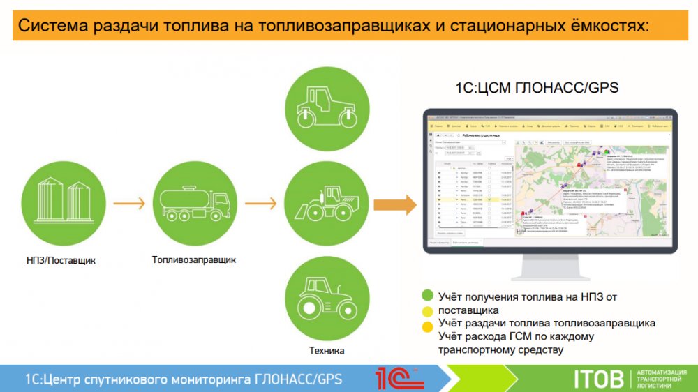 «1С:Предприятие 8. Центр спутникового мониторинга ГЛОНАСС/GPS» — новое специализированное решение на платформе «1С:Предприятие 8.2». Предназначенное для осуществления ГЛОНАСС/GPS мониторинга подвижных объектов, транспорта и персонала. Функциональные возможности решения позволяют получать в реальном времени информацию о перемещении объектов. На которых установлены автомобильные и персональные трекеры; GPS-навигаторы с модулем GSM, КПК и коммуникаторы на базе Windows Mobile 5.0 и выше. С GPS и GPRS модулями. Возможно получение информации с различных датчиков (температурный, датчик уровня топлива, тревожная кнопка SOS, CAN шина и др.).