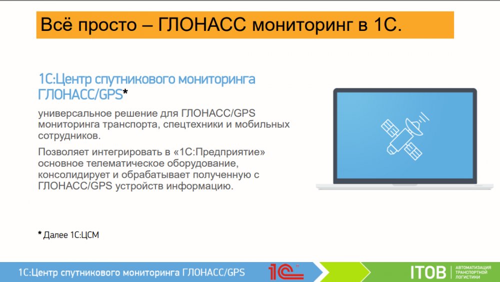 «1С:Предприятие 8. Центр спутникового мониторинга ГЛОНАСС/GPS» — новое специализированное решение на платформе «1С:Предприятие 8.2». Предназначенное для осуществления ГЛОНАСС/GPS мониторинга подвижных объектов, транспорта и персонала.