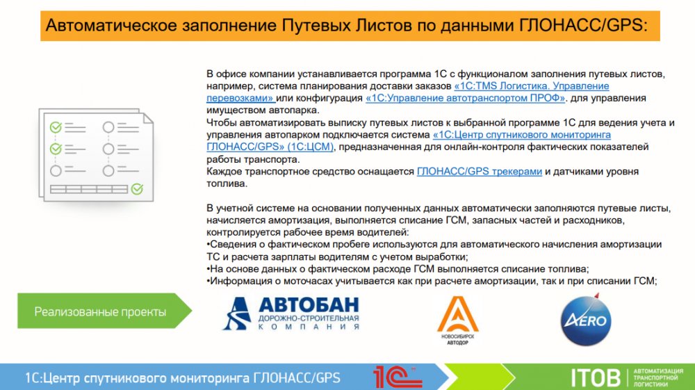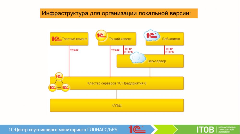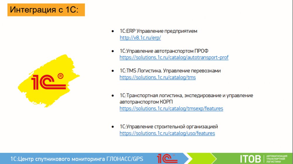 «1С:Предприятие 8. Центр спутникового мониторинга ГЛОНАСС/GPS» при необходимости может быть интегрирован как в типовые, так и в отраслевые решения на платформе «1С:Предприятие 8».