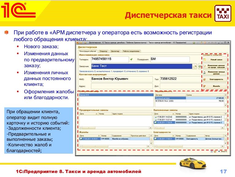 Совместное решение «1С Такси и аренда автомобилей на 100 авто» предназначено для автоматизации управленческого и оперативного учета в компаниях, работающих на рынке легковых такси и аренды автомобилей.