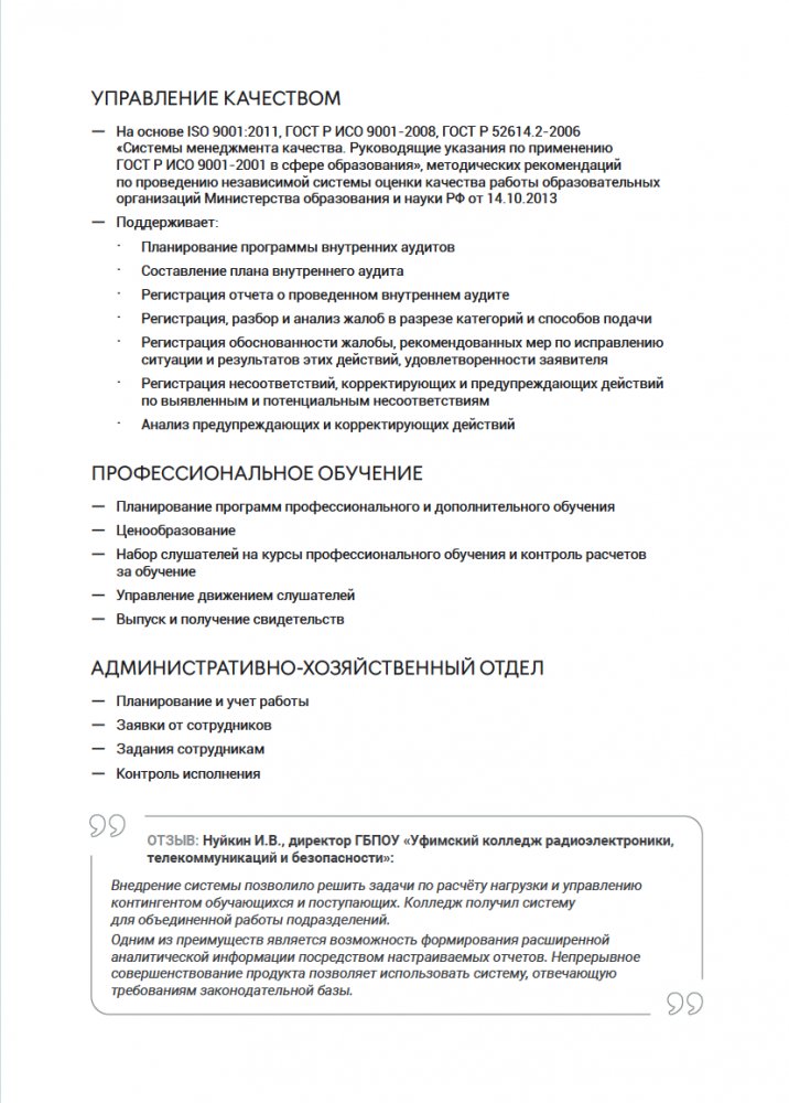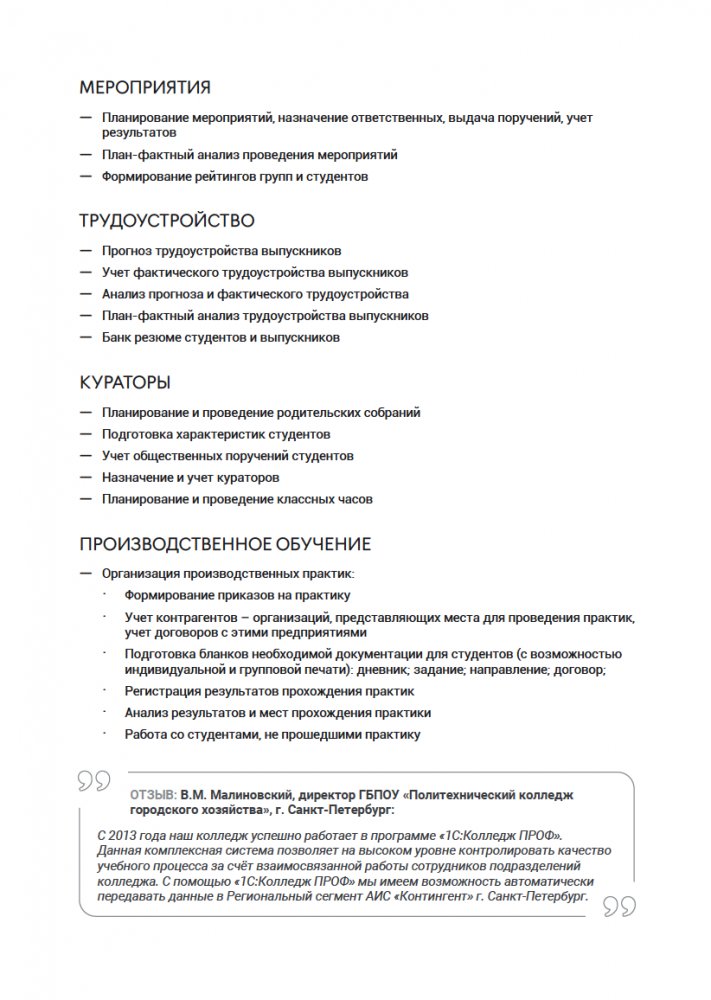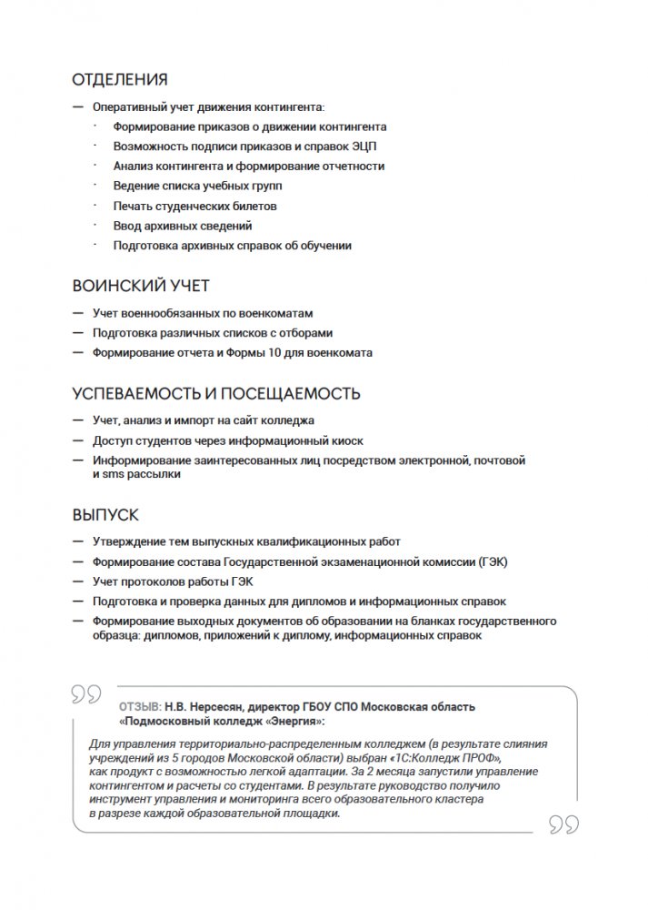 Продукт 1С Колледж ПРОФ представляет собой комплексное решение для управления деятельностью образовательных организаций среднего профессионального образования, предъявляющих повышенные требования к уровню автоматизации и позволяет автоматизировать практически все участки управления: