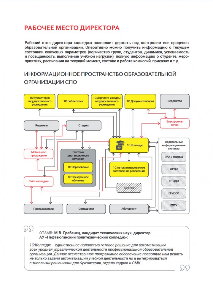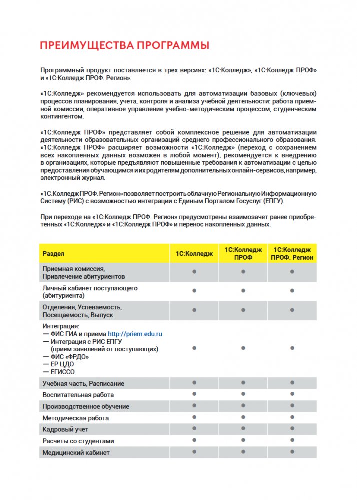 1С Колледж ПРОФ охватывает все уровни управленческой деятельности основных подразделений колледжа и интегрируется с типовыми решениями фирмы «1С» для бухгалтерии, отдела кадров, библиотеки, автоматизации электронного обучения.