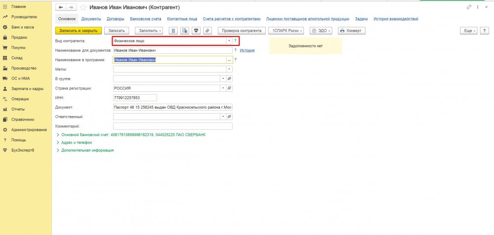 В начале необходимо внести контрагента в справочник Контрагенты с видом контрагента Индивидуальный предприниматель или Физическое лицо в зависимости от статуса физического лица. Остальные данные заполняются в обычном порядке.
