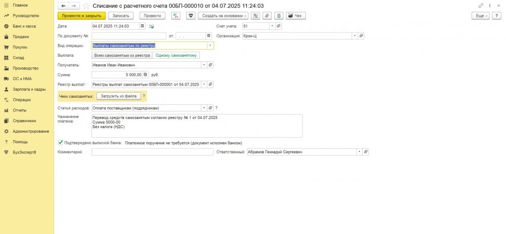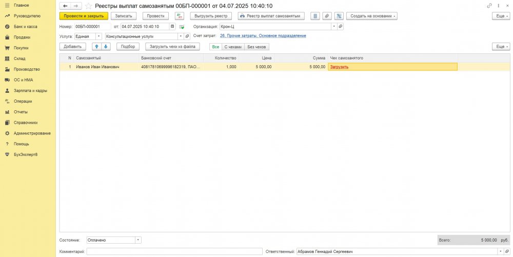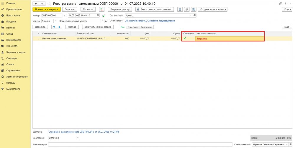 После проведения документа Списание с расчетного счета в документе Реестры выплат самозанятым в табличной части должно добавиться две колонки Оплачено и Чек самозанятого. По ссылке Загрузить можно загрузить в базу чек самозанятого, если он не был загружен.