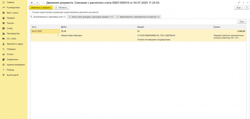 В поле Самозанятый контрагент должен иметь вид Физическое лицо или Индивидуальный предприниматель. По кнопке Выгрузить реестр можно выгрузить реестр выплат самозанятым в формате csv и передать в банк, банк самостоятельно проверит наличие у контрагентов статусов самозанятых и после оплаты пришлет файл с полученными чеками.