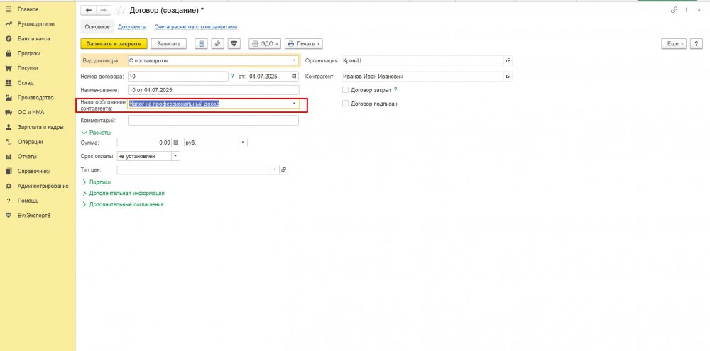 Затем создается договор с самозанятым, перейти в него можно из карточки контрагента по ссылке Договоры. В договоре выбираем вид договора – с поставщиком, Налогообложение контрагента – Налог на профессиональный доход.