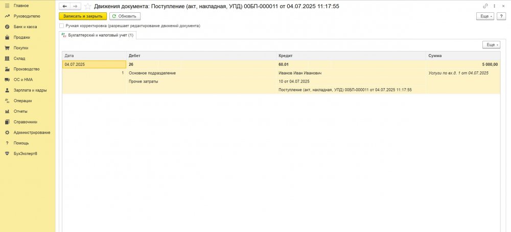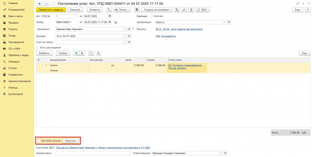 Поступление услуг от самозанятого оформляется документом Поступление услуг (акт, УПД) в разделе Покупки. В документе заполняется Контрагент – Самозанятое лицо, договор с самозанятым, Счет учета, номенклатурная группа, статья затрат.