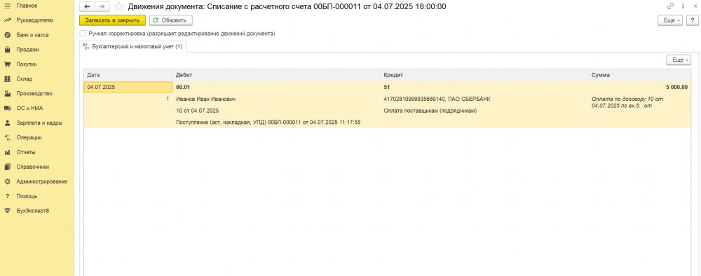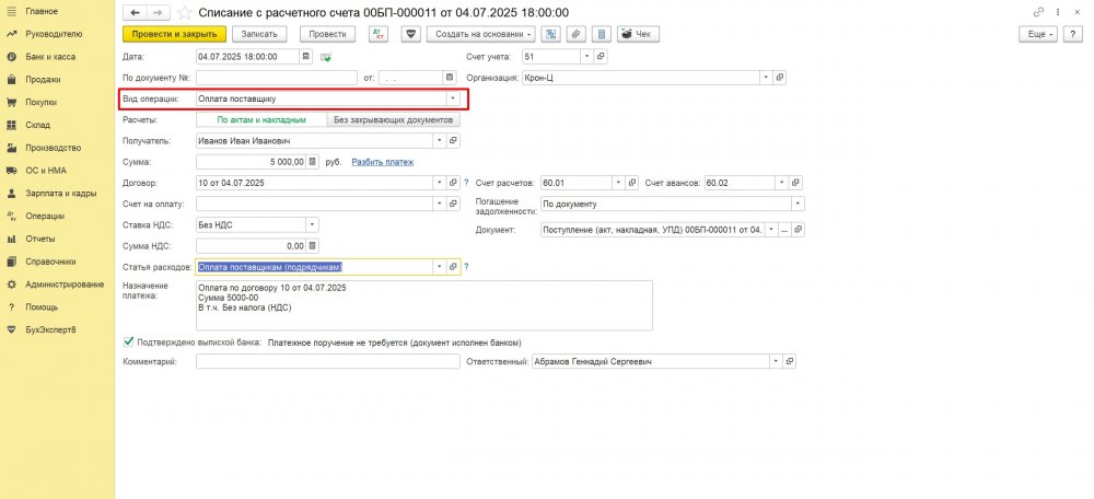Оплата самозанятому отражается документами Списание с расчетного счета (при безналичных расчетах) или Выдача наличных (при наличных расчетах). С видом операции Оплата поставщику.