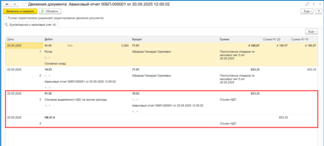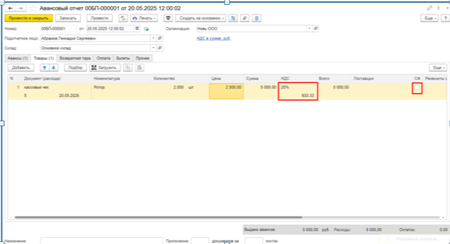 Если товары приобретены подотчетным лицом, то при заполнении авансового отчета списание НДС будет происходить автоматически. Банк и касса – Авансовые отчеты.