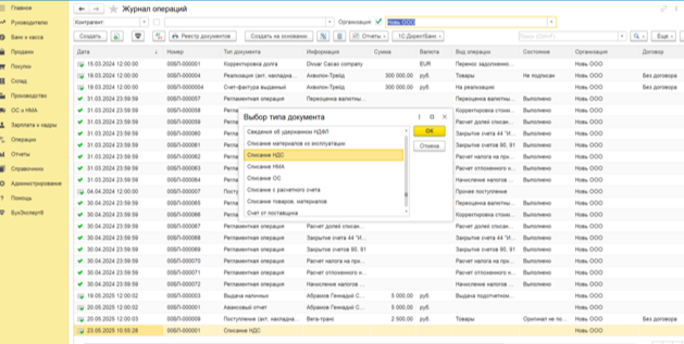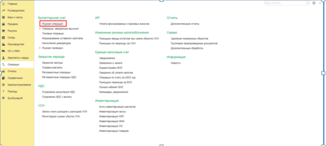 Создание документа Списание НДС. В основном интерфейсе раздел Операции подраздел Бухгалтерский учет выбрать Журнал операций.