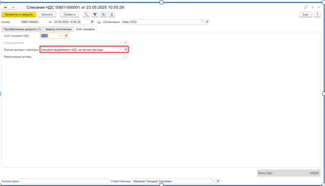 Списанный НДС отражается на счете 91.02 по статье Списание выделенного НДС на прочие расходы. Списанный НДС накапливается на забалансовом счете НЕ.01.9 в течение календарного года.
