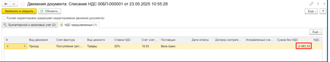 После проведения документа, кроме бухгалтерских записей, движения сформируются по регистру накопления НДС предъявленный.